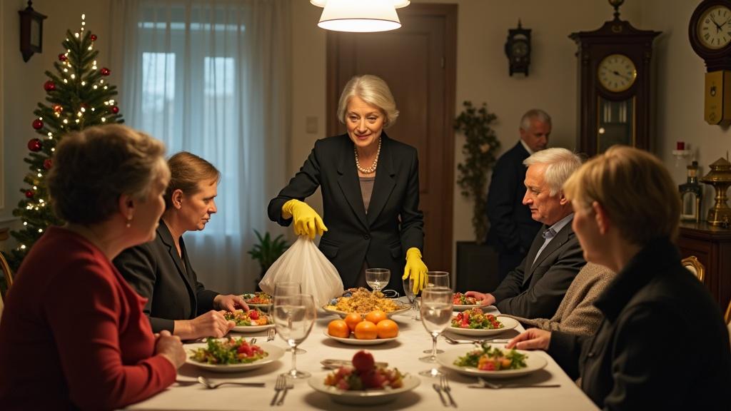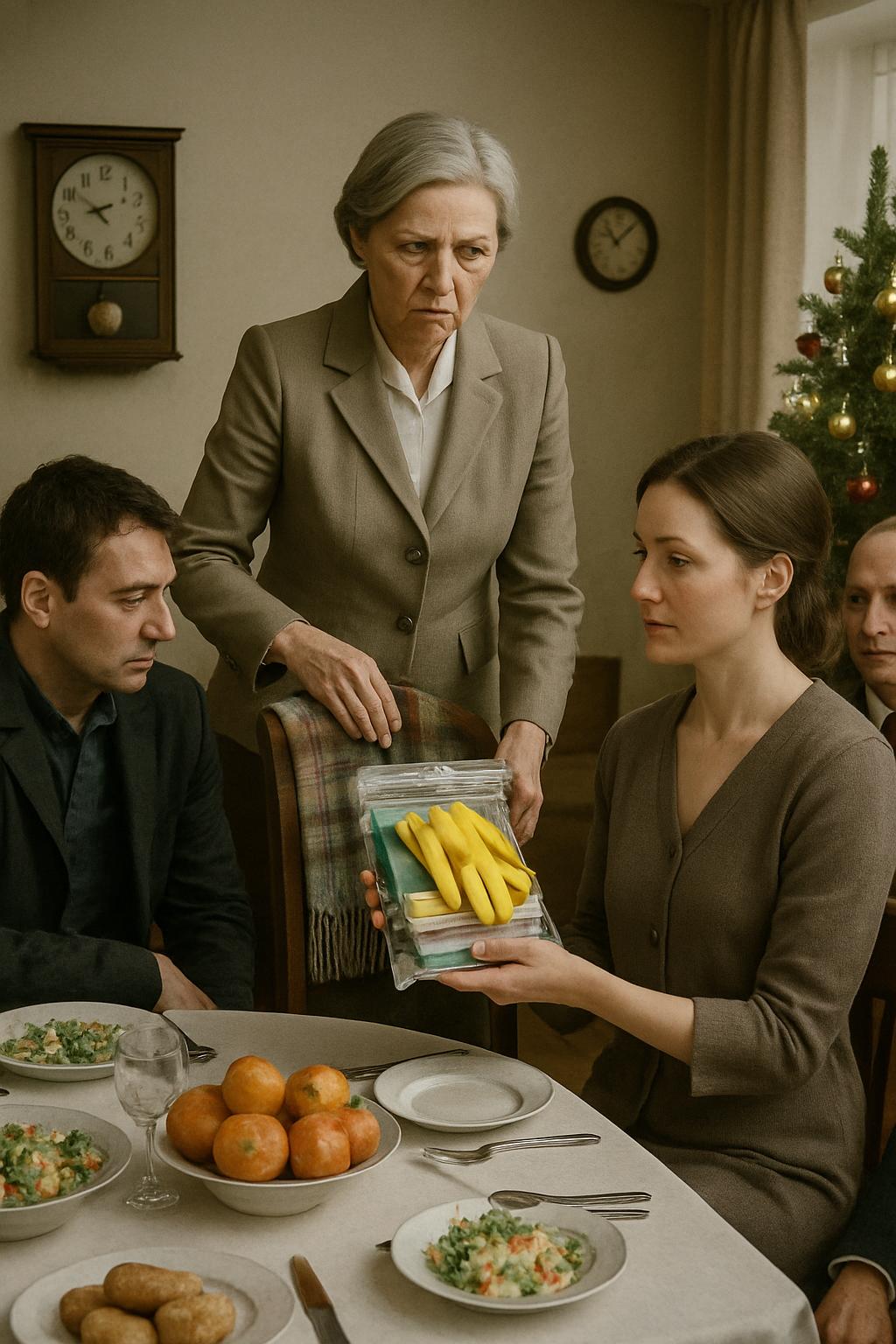 Tada mi je postalo jasno: ako sada prećutim, ćutaću zauvek. Ove krpe prestaće da budu običan predmet i postaće znak mog mesta u ovoj kući. Sedela sam za prazničnom trpezom po svim pravilima: pihtije su podrhtavale na ovalnom tanjiru poput drhtave krune; ruska salata bila je oblikovana u savršenu kupu; mandarine poređane tačno na sredini; jelka je blještala ukrasima u nijansama zlata. Na zidu su otkucavali masivni satovi, teški i autoritativni poput same Gordane Samardžić. Prostorijom se širio miris majoneza pomešan s skupim parfemom i nečim još neuhvatljivim — nečim što je podsećalo na potrebu da se sve drži pod kontrolom.