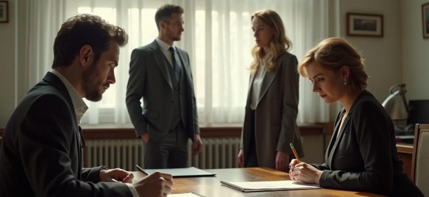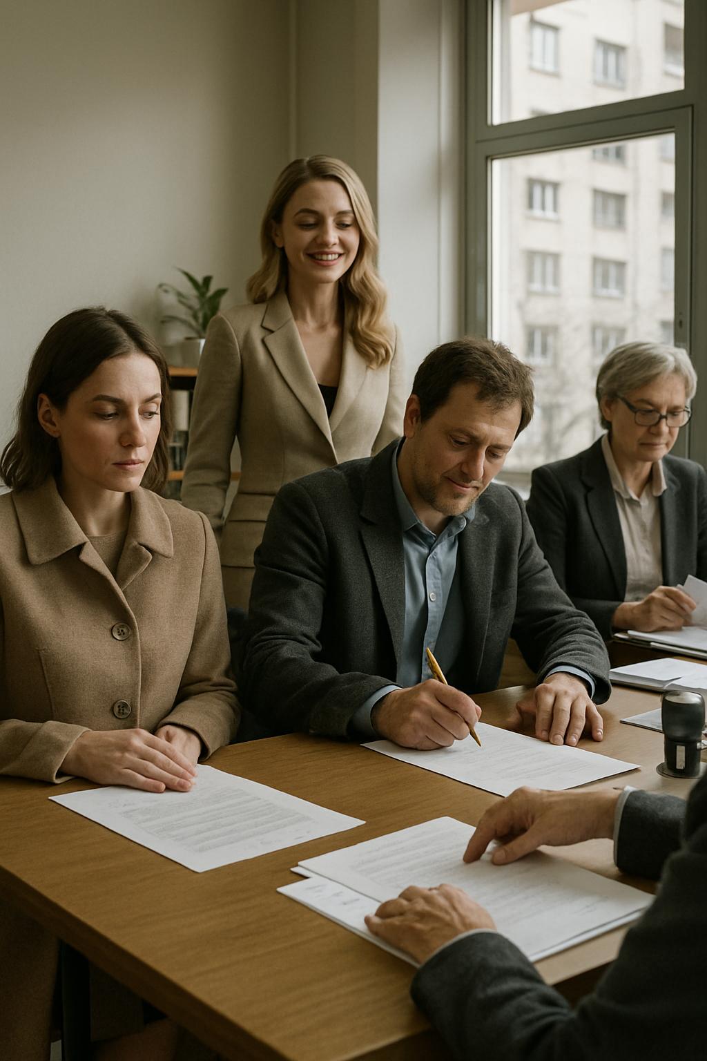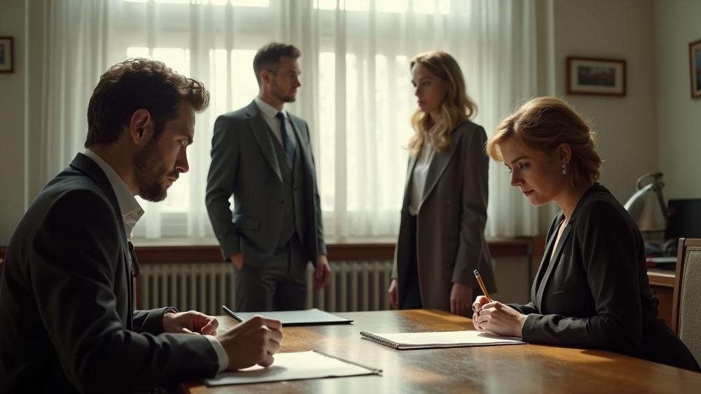 Notarka, vremešna žena sa strogim naočarima, nije obraćala pažnju na napetost u prostoriji. Navikla na ljudske lomove, rutinski je prelistavala papire, hladna i precizna.