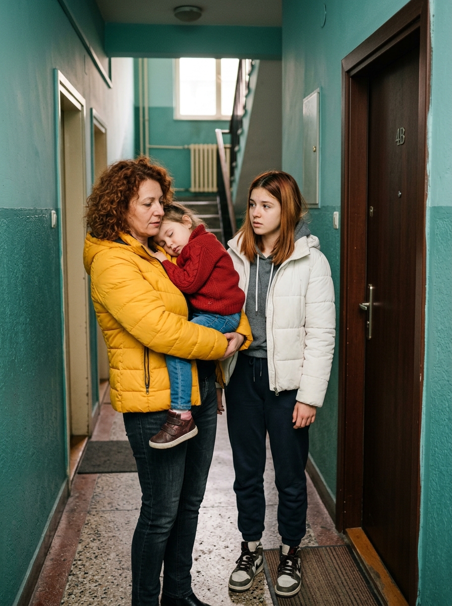 Na sedmom spratu zatekla je obe ćerke. Sara je čučala pored mlađe sestre, obgrlivši je i obavivši joj oko vrata svoj šal, dok je preko nje prebacila raskopčanu jaknu. Ema nije plakala — samo je gledala majku širom otvorenih, uplašenih očiju. Ruke su joj bile ledene.