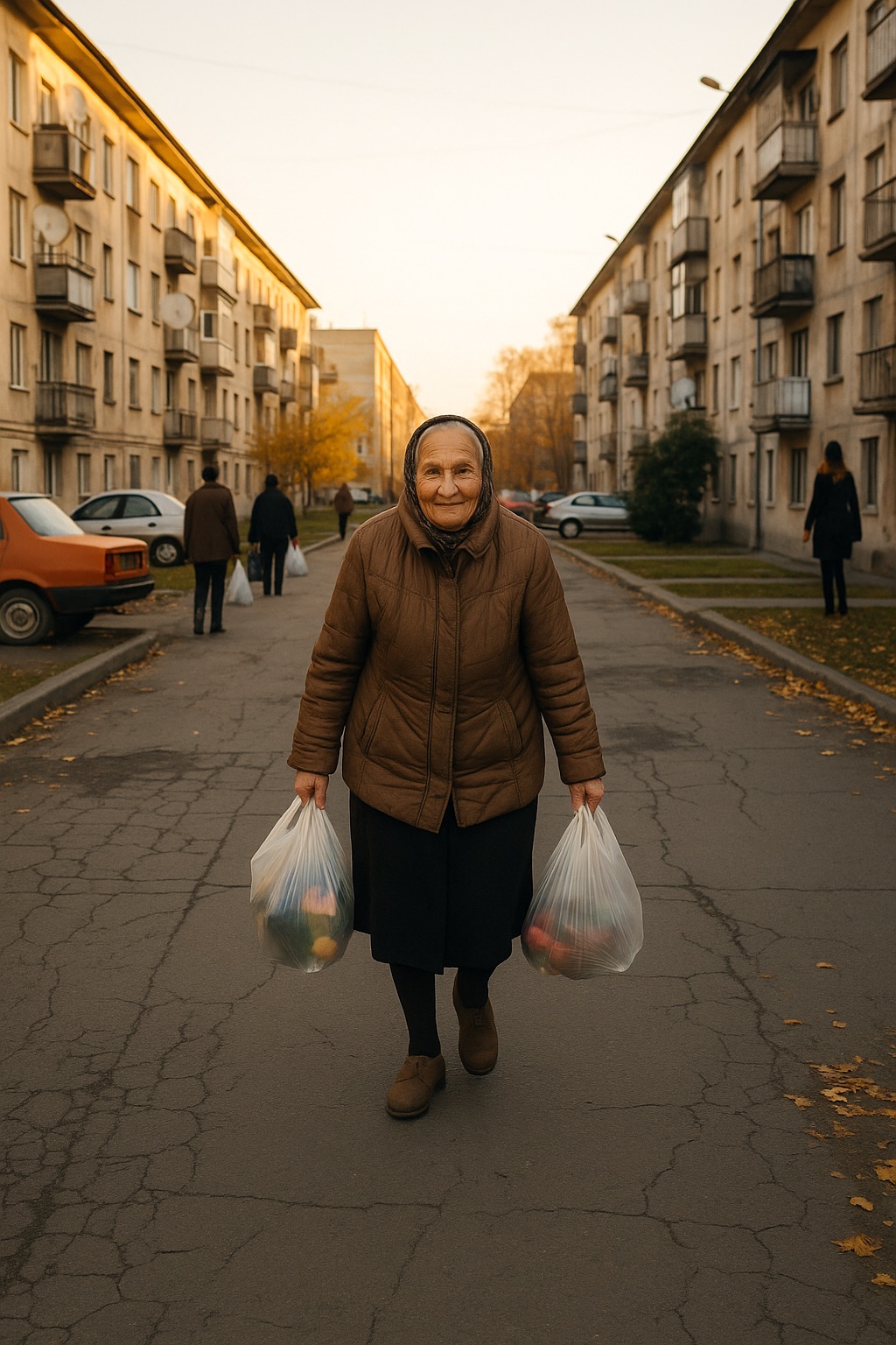 U 14:35 mama izlazi — u svojoj najboljoj jakni, onoj „za crkvu“. U rukama dva teška đilaša.